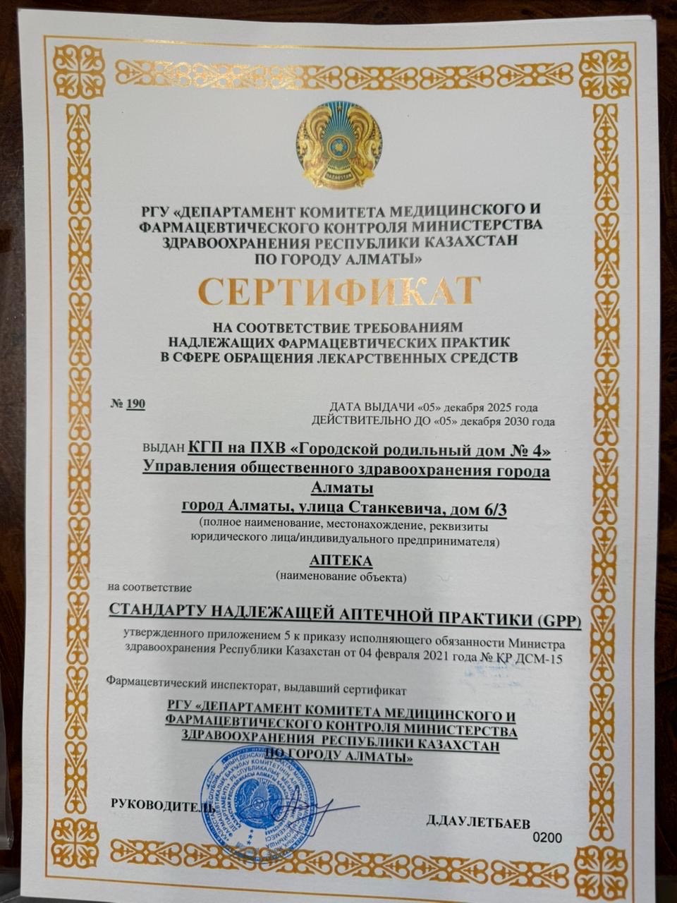 Алматы қаласы Денсаулық сақтау басқармасына қарасты «№4 қалалық перзентхана» ШЖҚ КМК дәрілік заттардың айналымы саласындағы тиісті дәріханалық практика (GPP – Good Pharmacy Practice) талаптарына сәйкестігін растайтын сертификаттаудан алғашқылардың бірі болып сәтті өтті.